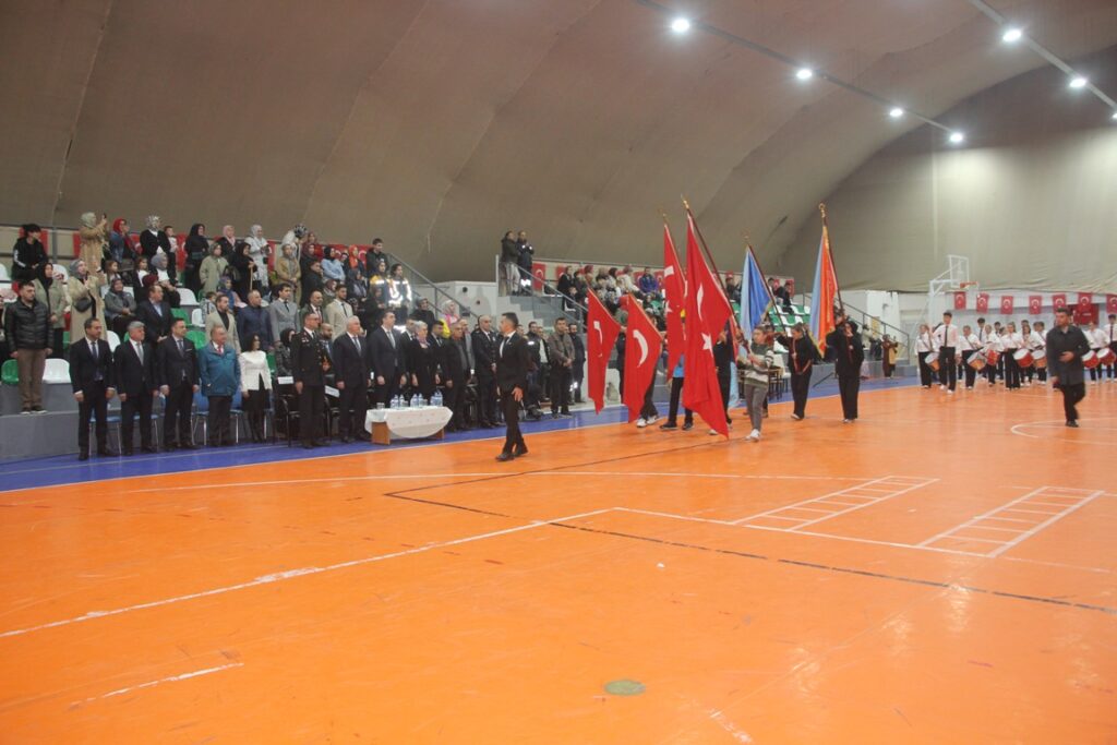 Tebriklerin kabulünden sonra Güce Kapalı Spor Salonuna geçildi. Tören saygı duruşu ve İstiklal Marşı’nın okunmasının ardından İlçe Kaymakamı Ali Can Uludağ ve Belediye Başkanı Aytekin Boduroğlu tarafından halkın ve öğrencilerin bayramını kutlaması ile devam etti.