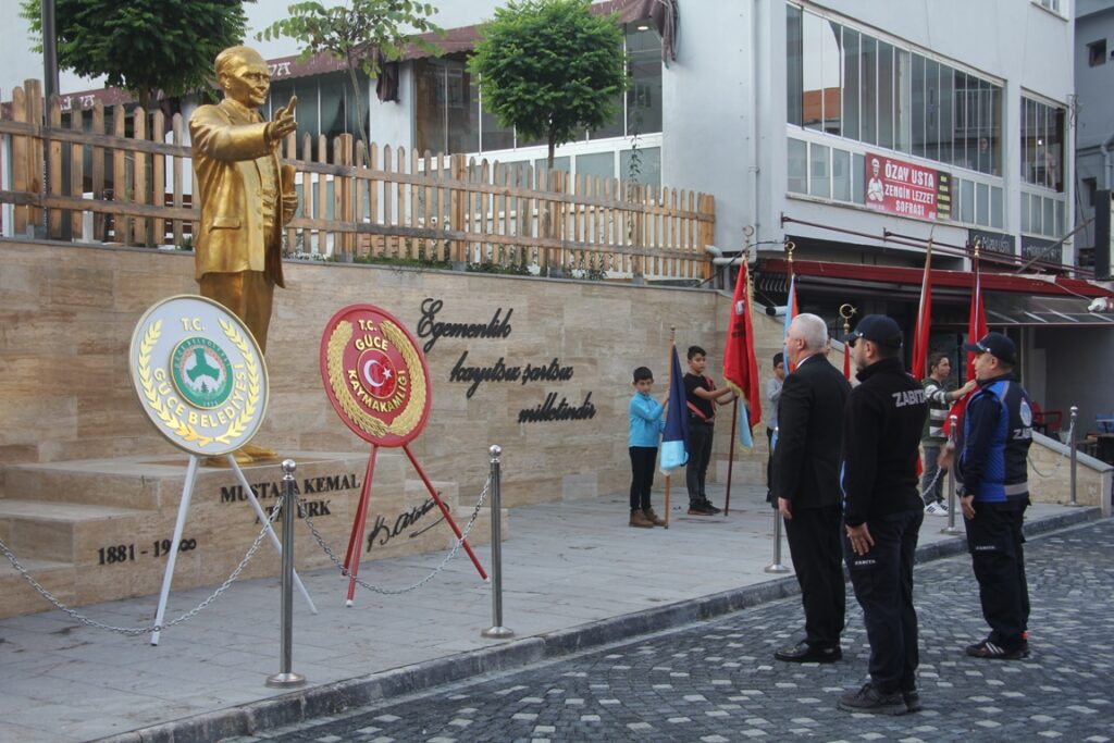 Belediye Meydanındaki tören alanında gerçekleşen anma programı,Güce Kaymakamı Ai Can Uludağ ve Belediye Başkanı Aytekin Boduroğlu’nun Atatürk Anıtı’na çelenk sunma töreni ile başladı.