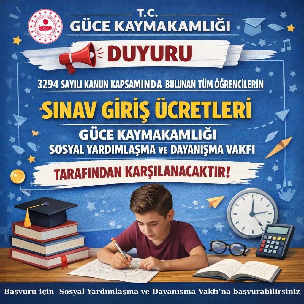 Sınav sürecindeki tüm öğrencilere başarılar dileyen Kaymakam Uludağ,”İlçe Kaymakamlığı olarak geleceğimizin teminatı olan gençlerimizin eğitim hayatlarına destek olmaya devam ediyoruz. Bu kapsamda 3294 sayılı Sosyal Yardımlaşma ve Dayanışma Kanunu hükümleri uyarınca, belirlenen kriterlere uygun tüm öğrencilerin sınav giriş ücretleri, Güce Kaymakamlığı Sosyal Yardımlaşma ve Dayanışma Vakfı tarafından karşılanacaktır. Eğitimde fırsat eşitliğini sağlamak ve öğrencilerimizin üzerindeki yükü hafifletmek amacıyla başlattığımız bu destekten faydalanmak isteyen öğrencilerimizin, detaylı bilgi almak ve başvurularını yapmak üzere Güce Kaymakamlığı Sosyal Yardımlaşma ve Dayanışma Vakfımıza şahsen müracaat etmeleri gerekmektedir. Unutmayın, geleceğimiz sizin ellerinizde! Başarılarınızda yanınızdayız” dedi.